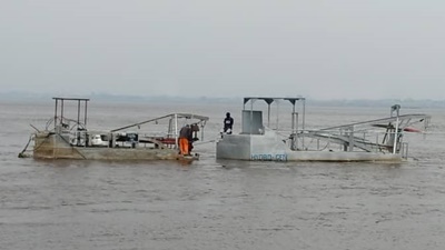 Eté 2025 : Une photo de la nouvelle hydrolienne congolaise, amarrée derrière sa consœur de 2023 pour commencer ses essais. Elle est plus grande, plus puissante, mais aussi plus simple que sa consœur. Elle sera installée dans le village de Kibangou sur le fleuve Niairi, pour alimenter une Unité de Services Essentiels (" USE ", plateforme de formation et d'activités professionnelles).